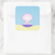 Pink and purple seashell with a beautiful pearl, beach landscape, blue sky, yellow sand.