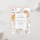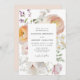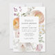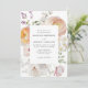 Elegant floral wedding invitations featuring your wedding details framed by watercolor flowers and foliage in shades of peach, ivory, orange, blush pink, purple, yellow, and green. Personalize the spring floral wedding invitation with your names and wedding details below. The stunning floral invite is perfect for spring and summer garden weddings.