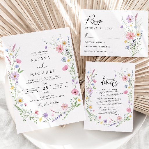 This romantic wildflower bridal shower invitation features soft, hand-painted watercolor florals arranged in an airy meadow design. Delicate pastel blooms and flowing greenery frame your details for a timeless, garden-inspired look that’s perfect for spring and summer bridal showers.