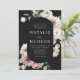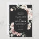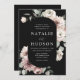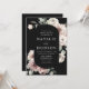 Elegant winter floral wedding invitations featuring your wedding details displayed in dark green lettering nestled inside of an oval floral frame with a black background. The winter flowers feature a colour palette of dusty rose, light pink, ivory, and soft golden yellow with eucalyptus leaves and winter foliage in shades of sage green and rich forest green.