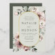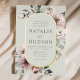 Elegant winter floral wedding invitations featuring your wedding details displayed in dark green lettering nestled inside of a gold foil oval floral frame with a sage green background. The winter flowers feature a colour palette of dusty rose, light pink, ivory, and soft golden yellow with eucalyptus leaves and winter foliage in shades of sage green and rich forest green.