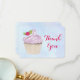 Une carte de remerciements avec l'illustration d'un délicieux cupcake aux tourbillons roses et une baie aux feuilles nichés dans le gel. Placé sur un arrière - plan pastel bleu clair.
