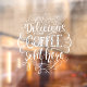 This coffee shop window cling features whimsical hand lettering that says "Delicious Coffee Sold Here" in white on a clear background. The lettering features decorative swashes and ornamental swirls.