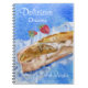This blue watercolor binder is of a crusty french baguette and two strawberries against a textured background of blues. Text in white reads "Delicious Dreams and Magic" in two fonts, Change ANY OF the text or font to create your personalized gift photo binder. If you need help customizing, contact lilly@lillyarts.com