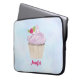 A personalized laptop sleeve with an illustration of a delicious cupcake with pink swirls and a berry with leaves nestled in the frosting.