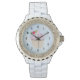 A watch with an illustration of a delicious cupcake with pink swirls and a berry with leaves nestled in the frosting.