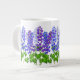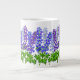 Original fine art design of blue and purple Delphinium or Larkspur flowers by artist Carolyn McFann of Two Purring Cats Studio on a quality mug for floral art fans.