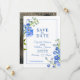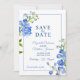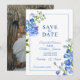 Beautiful delphinium spikes painted blue botanical art and photo on reverse wedding save the date invitation. Edit this save the date wedding card with your own words and special photo. Unique design and original hand painted pan watercolor fine flower art by Sarah Trett exclusively for www.mylittleedenweddings.com on Zazzle.