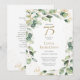 Cette invitation de fête d'anniversaire pour 75 ans avec carte de vœux, ornée d'un délicat eucalyptus à l'aquarelle et de feuilles d'or ainsi que de points éclaboussés d'or est parfaite pour célébrer votre épouse, maman, sœur, tante, amie, grand-mère. Son design fluide et doux est moderne tout en étant traditionnel. Au verso, une demande de carte de vœux élégamment formulée et un brin d'eucalyptus coordonné. Sélectionnez "Personnaliser ce modèle" pour le rendre unique. En quelques secondes, vous verrez vos superbes invitations pour une fête d'anniversaire de 75 ans.