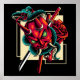 A vibrant, stylized illustration depicting a fierce, red Oni mask surrounded by a coiled snake and a crossed katana. A blooming red rose adds a touch of contrast and symbolism. The design is framed by a square border, enhancing its bold and dramatic aesthetic.