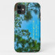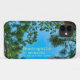 "Dendrophile" meaning custom text colour iPhone 11 Case. This unique phone case features the word "dendrophile", representing a person who loves trees, set against a stunning image of pine tree branches against a bright blue sky. The text colour can be customized to suit your personal style and preferences.