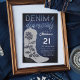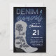 A modern, elegant and chic 21st birthday party invitation with a denim and diamonds theme. It features a denim background, a denim blue cowgirl boot with an elegant rose covered in rhinestones (this is a digital effect), and typography in white. A chic, stylish and classy "denim and diamonds" design for a girl turning twenty-one!