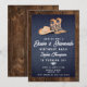 A rustic, modern, elegant and chic birthday party invitation with a denim and diamonds theme. It features a denim background on a distressed wood board, a pair of cowgirl boots with a rose detail covered in rhinestones (this is a digital effect), a cowgirl hat with a rhinestones detail (also a digital effect) and typography in white. A chic "denim and diamonds" design for a woman on her birthday!