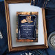 A rustic, modern, elegant and chic birthday party invitation with a denim and diamonds theme. It features a denim patch background on a distressed wood board, a pair of cowgirl boots with a rose detail covered in rhinestones (this is a digital effect), a cowgirl hat with a rhinestones detail (also a digital effect) and typography in white. A chic "denim and diamonds" design for a woman on her birthday!