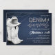 A modern, elegant and chic, rustic glam 50th birthday party invitation with a denim and diamonds theme. It features a denim background, a white pair of cowgirl boots with a white cowgirl hat resting on top, featuring rhinestones details (this is a digital effect), and typography in white, with custom writing for the headline "denim and diamonds" to resemble denim buttons and rhinestones respectively. A chic, rustic glam, stylish and classy "denim and diamonds" for a modern woman celebrating a milestone fiftieth birthday.