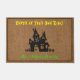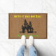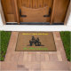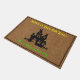Use during all of October! This is a 24"x36" brownish-gold denim print doormat with "Enter at Your Own Risk" at top in yellow lettering. A whimsical black haunted house in centre and family name, or Jack & Jill personalization, in lime green script lettering at bottom. Easily change, add to or remove the text using the Template provided. A smaller 18"x24" doormat is also available. Non-slip rubber that won't crack or buckle, this mat resists fading, mould, and mildew and can be easily cleaned with a hose. See "About This Product" at side for more information. Oh, and huge spider hanging at haunted house door.