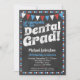 A fun and unique dental graduation party invitation in chalkboard style with red, white and blue flags and a whimsical polka-dot border with dots on the back.