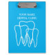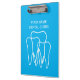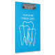 Custom dentist, dentistry and dental office accessories clipboard for office planning and other work schedules. Add your own name, quote, business name or company slogan. Blue double sided tooth logo print with modern typography template. Personalized supplies for dental hygienist, assistant, medical doctor, store, shop, clinic etc.