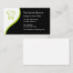 Modern dentist business card template in a sleek design that includes a happy tooth symbol and green, white, and black colour combination that really stands out. Customize the text the way you want. Deigned for a dentist office and staff, dental group or clinic.