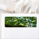 Photo d'un robin perché sur une branche d'arbre recouverte de mousse dans une forêt. L'oiseau est de retour à la caméra et il a l'air droit. De jeunes arbres dans l'arrière - plan portent des feuilles d'été, et le ciel bleu est vu dans les quelques ouvertures entre feuilles et branches. Copyright ©2021 Kimberly J Tilley.