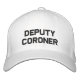 Complete your professional look with our sleek white Hat featuring "Deputy Coroner" in bold black lettering on the front. This hat is the perfect accessory for Deputy Coroners who prioritize both style and functionality.
