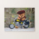 Ein Teddybär steht hinter einem Motorrad vor grüner Natur