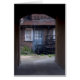 une photo d'une porte avec des pots de crabe devant, une photo à travers une ruelle