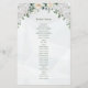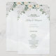 Cette carte de programme de mariage a un style doux et élégant avec une palette de couleurs pastel dominée par des nuances de vert et de blanc.