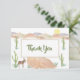 Desert Adventure Begins Succulent Boho Thank you Card for a baby shower. Thank your guests for attending the baby shower and/or for the beautiful gifts they may have brought, and the games they played. The design is a watercolor with rolling desert mountains, a road for adventure, cactus and other succulents, a sunset and a donkey.