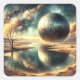 A massive metallic sphere hovers over a reflective, barren landscape, creating an eerie yet mesmerizing scene. The sky is filled with vibrant, swirling clouds, casting dramatic reflections in the water below.