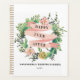 This wedding planner features a decorative cactus wreath with a prickly pear cactus a pink blossom. In the centre it says "happy ever after" in a black serif font. You can personalize with your names and year. Colours include green, pink, white and black.