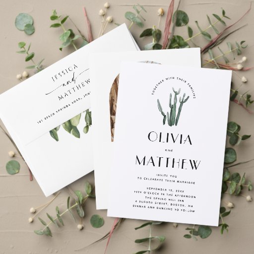 This elegant minimalist cactus wedding invitation is perfect for couples, families, or wedding planners planning a modern, rustic, or desert inspired event. The front features a hand painted watercolor cactus with clean serif typography. Ideal for boho or southwestern weddings. The back includes space for a personal photo and a scannable QR code. Perfect for linking guests to your wedding website, RSVP form, gift registry, or event details. This design is easy to customize and works for any kind of wedding, whether you’re hosting or sending invites for the couple. You can choose the digital download option for a more budget friendly choice or quick delivery. Print it yourself or at your preferred printing service!