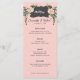 This desert bloom menu features pink blossoms and greenery on either side of a curvy black box with the word "Menu." All the important wedding menu details can be edited. Colours include green, pink, white and black.