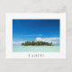 Postcard with a desert or uninhabited island with coconut palm trees in a turquoise blue lagoon in the Pacific Ocean in French Polynesia, near Tahiti with a white border and the text: 'Tahiti'.