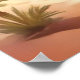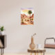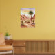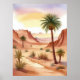 Poster in an illustration of a serene desert landscape showcasing golden sand dunes and rocky formations under a pastel sky, with lush palm trees scattered throughout. The soft, warm colours evoke a sense of tranquillity and natural beauty.