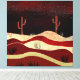 Abstract landscape scene of a desert with saguaro cactus, scrub brush, hills, and stars in shades of red, crimson, and beige and bold textures.
