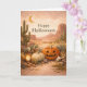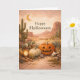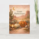 A warm, atmospheric Halloween illustration set in a serene Southwestern desert landscape. Beneath a soft crescent moon and scattered stars, towering cacti and distant red-rock mesas frame a quiet desert path. In the foreground, a cheerful jack-o’-lantern rests beside a pale pumpkin, desert wildflowers, and a glowing lantern that casts a gentle amber light. Subtle rustic details—weathered stones, dried grasses, and a sun-bleached skull—add a touch of Western folklore without tipping into darkness. The muted sunset palette of sand, terracotta, sage, and soft gold creates a calm, inviting Halloween mood that feels both rustic and refined.