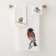 Un ensemble de serviettes avec des dessins d'oiseaux faits main. Serviette de lavage : Serviette à feu (Regulus ignicapilla) Serviette à main : Pekin Robin (Leiothrix lutea) Grande serviette : Stonechat européen (Saxicola Rubicola)