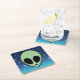 Une tête alien verte avec de grands yeux noirs ovales et une petite fente noire pour une bouche. L'arrière - plan est un dégradé foncé à bleu clair, parsemé d'étoiles blanches.