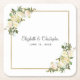Un design de mariage élégant présente des roses mariages blancs à la vanille romantiques avec des touches de rose roux, exposés dans la verdure verdoyante sur un arrière - plan blanc immaculé intemporel. Un cadre carré doré branché apporte une touche pétillante. Personnalisez les détails du mariage avec vos noms et la date du mariage dans des lettres et des scripts élégants gris charbon de bois.