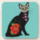 Un chat noir avec le jour du maquillage du crâne de sucre mort sur fond de turquoise