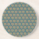 Un dessous de verre rond en grès, avec un motif de petits coeurs rouges et verts sur un arrière - plan turquoise foncé dans le style "Folk Art".