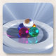 Image 3D créée en Vue, pleine de reflets et de lumières rayonnant de toutes les directions. Cinq sphères colorées de verre bleu, rose, turquoise, orange et diamant se dressent dans une pyramide entourée d'un anneau blanc translucide. Ils s'assoient sur un arrière - plan de rayons bleu pâle et blanc qui convergent sous les cinq boules de cristal.