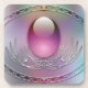 Un décor bleu pastel, lavande et rose avec un oeuf rose translucide dans un cadre argenté, entouré d'un cadre ovale argenté clair et composé de quatre pierres précieuses plus lisses comme des oeufs colorés.