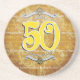 Montrez vos parties étonnées avec dessous de verre heureux de cet les cinquantième anniversaire. La coupe de pli de couleur d'or a conçu le cercle avec a conçu un grand nombre de "50" et l'arrière - plan a ; Anniversaire heureux dans les lettres blanches de police.