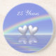 Elégant dessous de verre en grès avec mon oeuvre originale de deux coeurs d'argent flottant sur l'eau sous un arc-en-ciel avec un texte qui dit "25 ans".