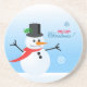 Dessous de verre de bonhomme de neige avec un bonhomme de neige blanc portant un casquette noir avec une feuille verte et une écharpe rouge et qui profite de la neige. © Matin 6
