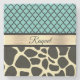 Un motif chic en quatrefoil sur un fond turquoise avec un ruban d'or pour la personnalisation et ci-dessous, une girafe design pour les vibes exotiques animales.