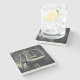 Un dessous de verre en pierre avec une photo sépia noire et blanche. Une photo d'une selle en cuir anglaise axée sur les brosses en argent. Parfait pour les amateurs d'équitation anglais.