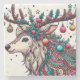 Cette illustration éclatante présente un renne orné de décorations de Noël complexes. Ses bois se transforment en un spectacle festif, orné de saints, de baies, d'ornements et d'étoiles scintillantes. La tête de renne est décorée de motifs et de perles colorés, qui capturent la joie et la magie de la saison des fêtes.